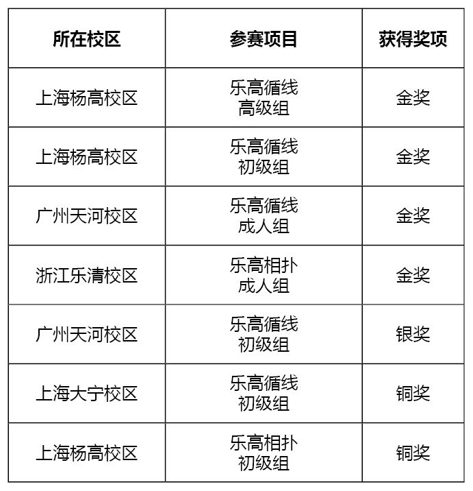 乐高循线成人组冠军队伍:广州贝乐七队;获奖选手:樊昱邨、徐培森、张海清、景诚誉;教练:韦海;所属校区:贝乐广州校区